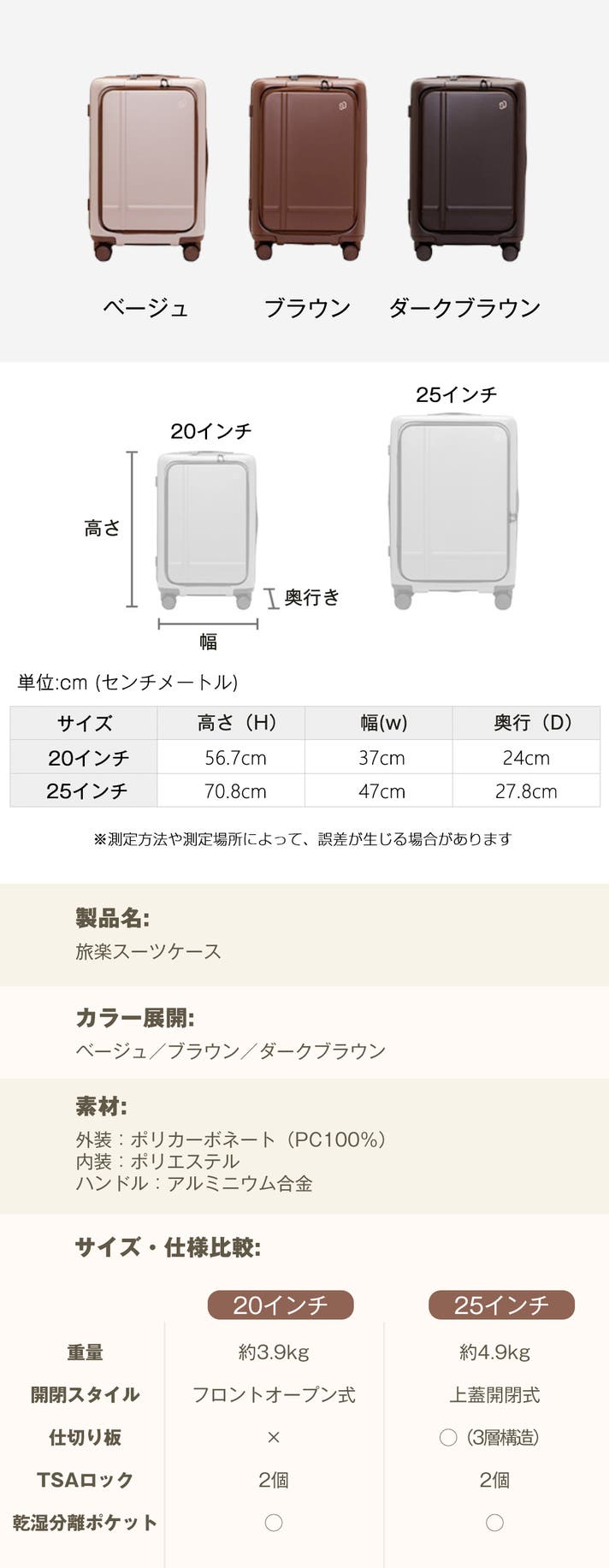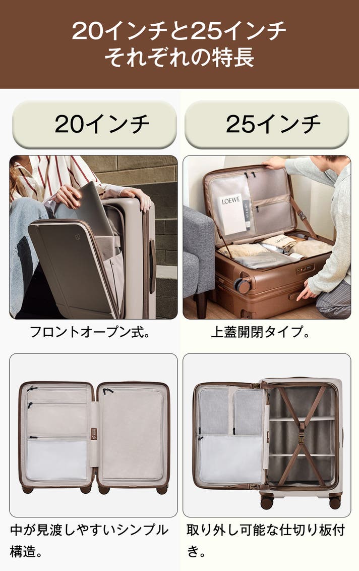 - 【20インチ】フロントオープン設計で、立てたまま荷物を出し入れ可能。出張や短期旅行に最適。