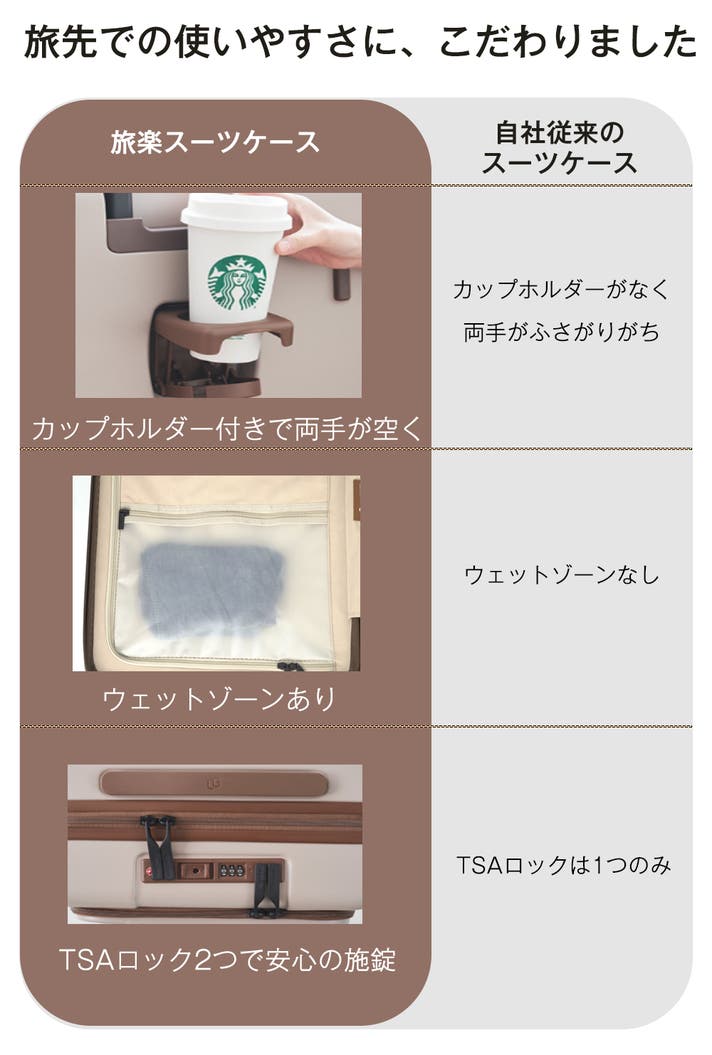 スーツケースに内蔵されたカップホルダーは、移動中の飲み物の置き場として活躍。