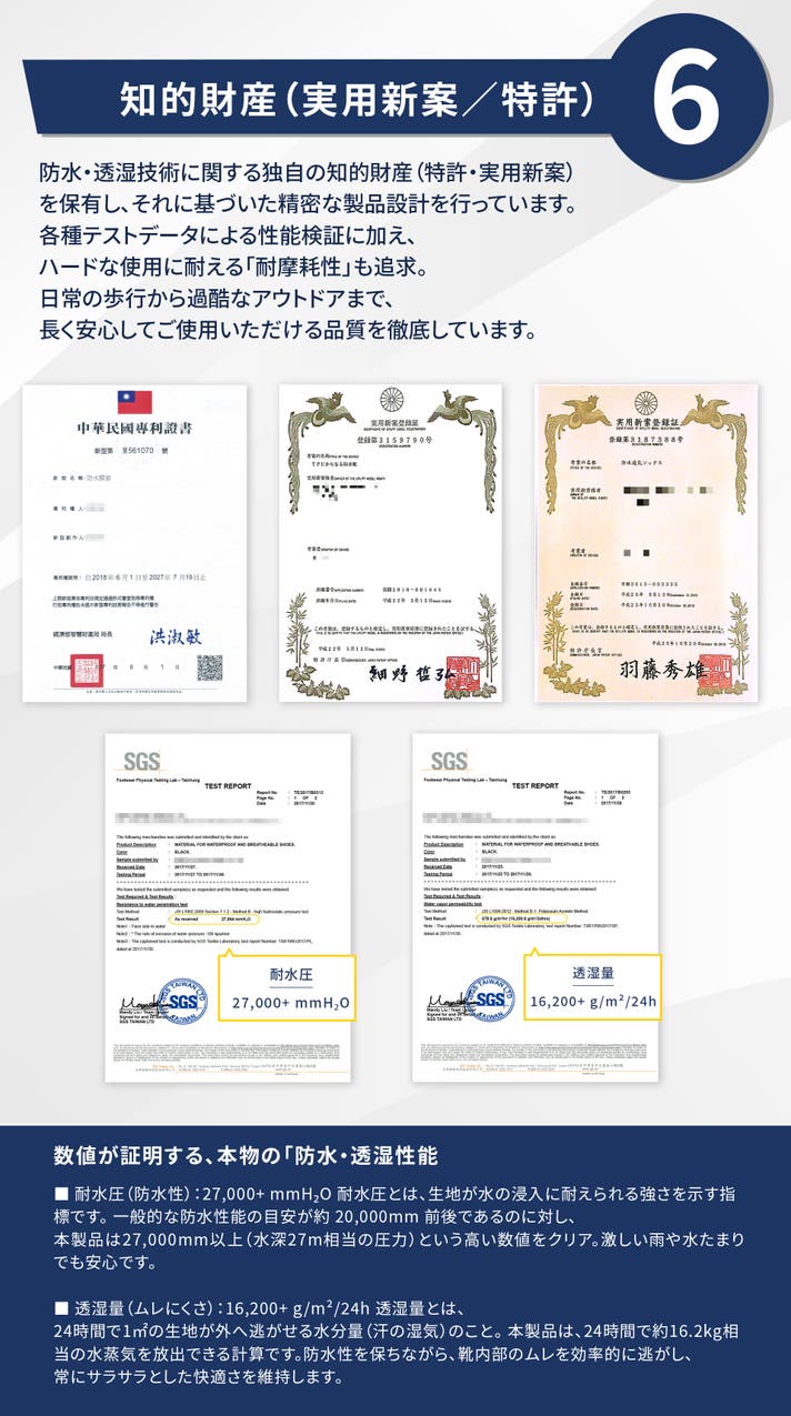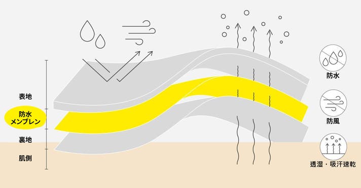 - 実用新案の三層構造。優れた防水透湿性で、外からの水をガードし、内側の蒸れを逃がす