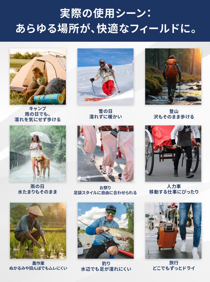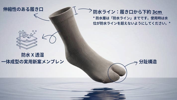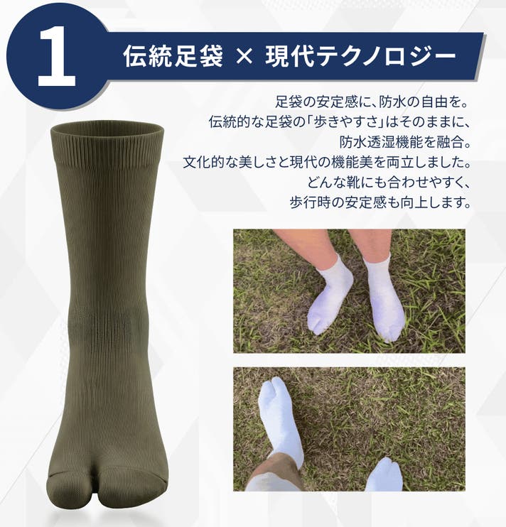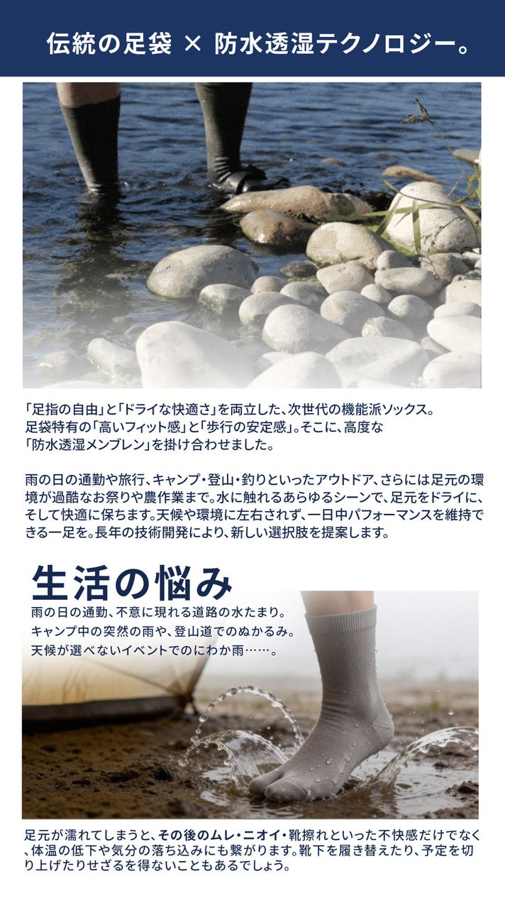 - 伝統の足袋形状×先進の防水機能。仕事から趣味の時間まで、足元の不快感を抑えて軽やかに