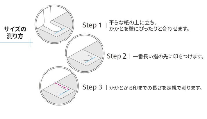 A:サイズ表をよくご確認のうえ、足長に合わせて(S/M/L)をお選びください。2サイズで迷う場合:フィット感重視は小さめ/甲高・幅広、またはゆとり重視は大きめがおすすめです。