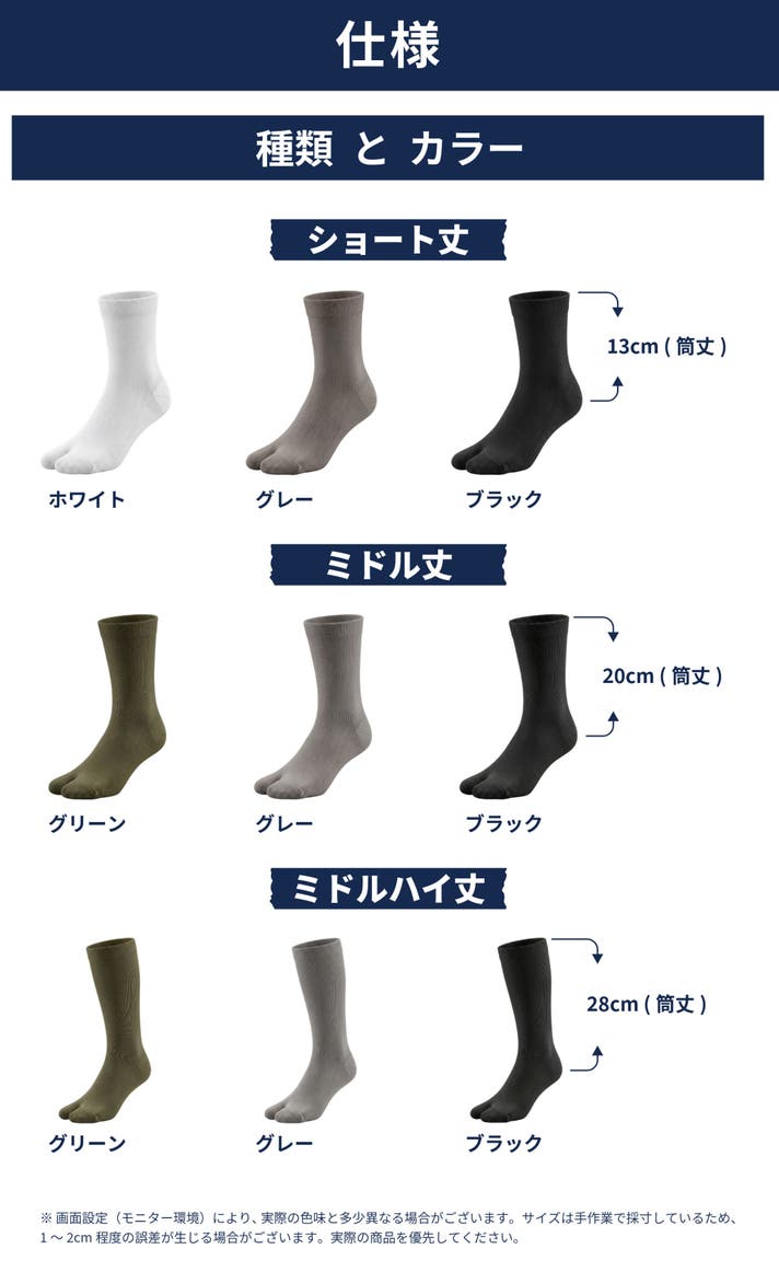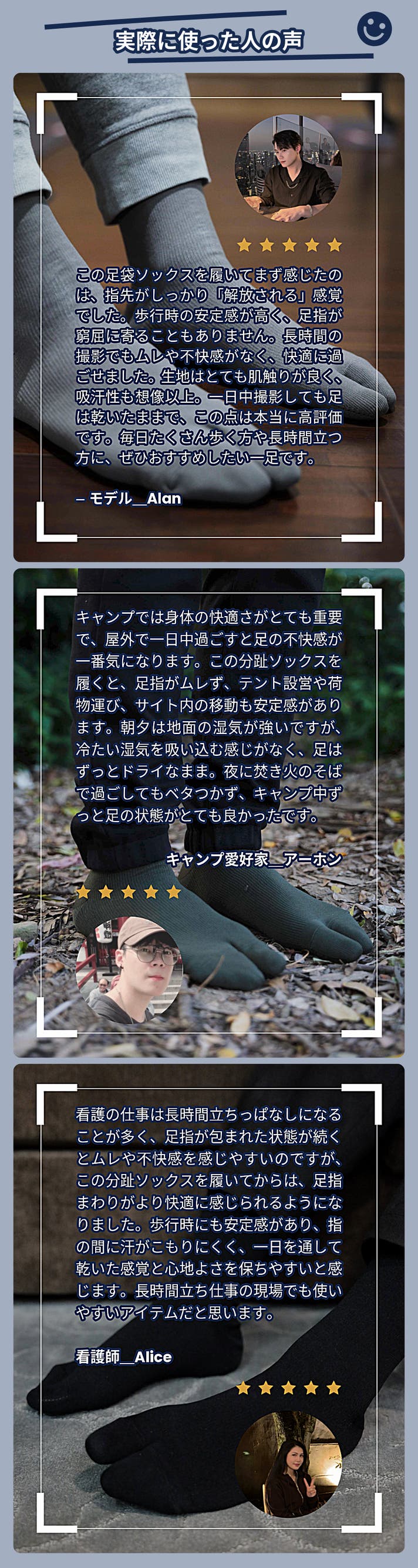 A:分趾(タビ)デザインのため、コーデの選択肢が広がります。ビーチサンダル・分趾シューズ・地下足袋はもちろん、一般的なスニーカー/カジュアルシューズにも合わせられます。