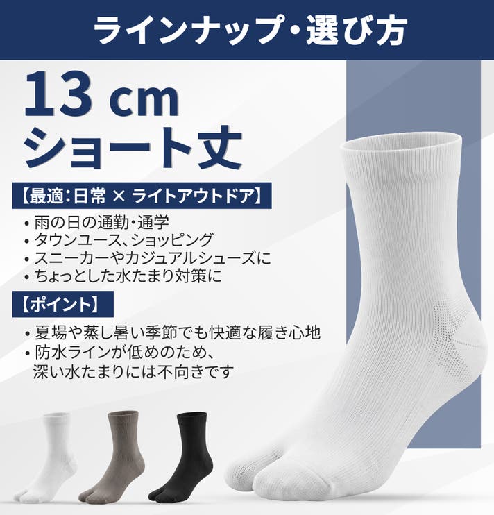 A:雨の日・湿った地面・浅い水たまり程度ならOKです。 ただし水位が履き口(ソックス口)より高くなると、浸水する可能性があります。防水層は履き口の下約3cm(防水ライン)までとなっております。ご使用の際は、水位が防水ラインを超えないようご注意ください。防水パンツなどで履き口を覆ってご使用ください。