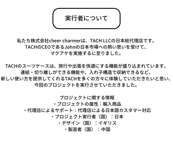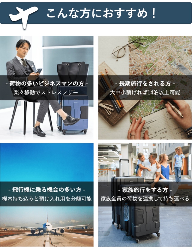 「Makuake(マクアケ)」は、実行者の想いを応援購入によって実現するアタラシイものやサービスのプラットフォームです。このページは、 プロダクトカテゴリの 「【数量限定】長期出張や家族旅行の強い味方!連結する・多機能スーツケース」プロジェクト詳細ページです。