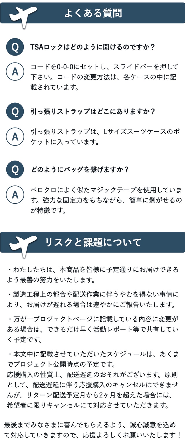 ・わたしたちは、本商品を皆様に予定通りにお届けできるよう最善の努力をいたします。 ・万一商品に初期不良があり、商品到着から7日間以内にご連絡いただいた場合、速やかに返品交換をさせていただきます。 ・製造工程上の都合や配送作業に伴うやむを得ない事情により、お届けが遅れる場合は速やかにご報告いたします。 ・万が一プロジェクトページに記載している内容に変更がある場合は、できるだけ早く活動レポート等で共有していく予定です。 ・本文中に記載させていただいたスケジュールは、あくまでプロジェクト公開時点の予定です。 応援購入の性質上、配送遅延のおそれがございます。原則として、配送遅延に伴う応援購入のキャンセルはできませんが、リターン配送予定月から2ヶ月を超えた場合には、 希望者に限りキャンセルにて対応させていただきます。 最後に、みなさまに喜んでもらえるよう、誠心誠意を込めて対応していきますので、応援よろしくお願いいたします!