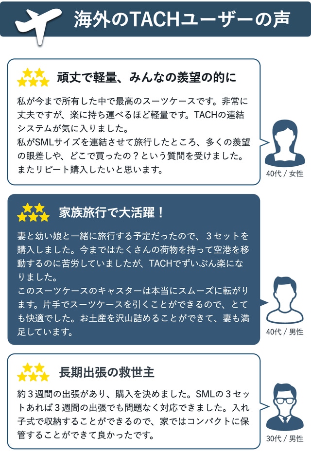 旅先でお土産が入りきらず、現地でスーツケースを買い足した経験はありませんか?TACHなら、旅先でお土産をたくさん買ってしまっても大丈夫。