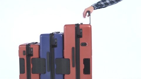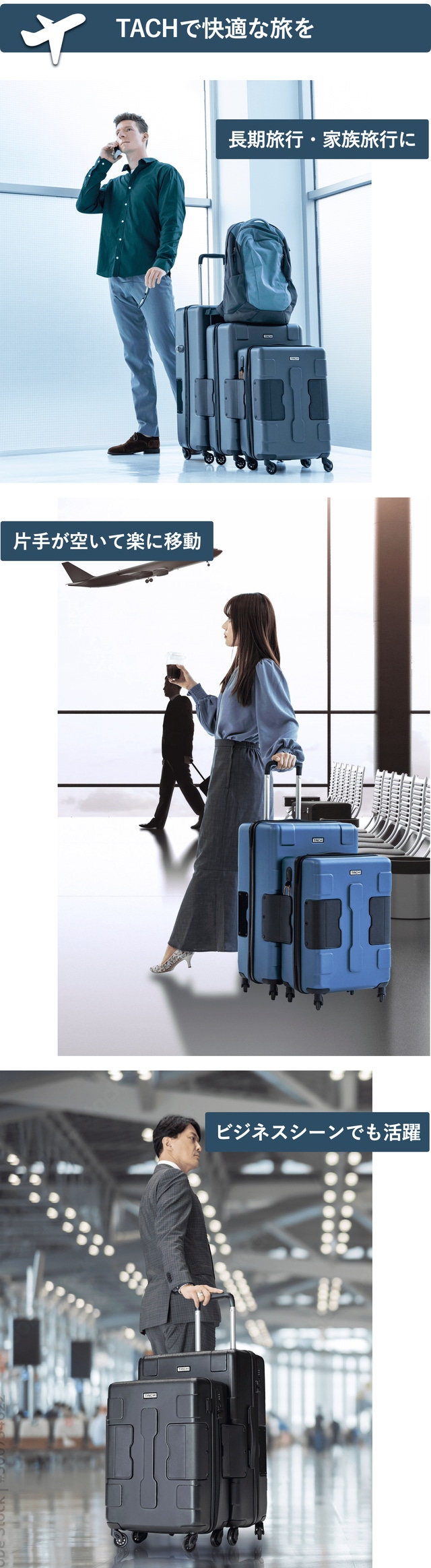 特許取得済みの連結システムにより、TACHのスーツケース同士を連結させることができます。 着脱可能なテープを使用した仕組みで電気を通しませんので、フライトの際でも機内持ち込みやお預け入れが可能です。