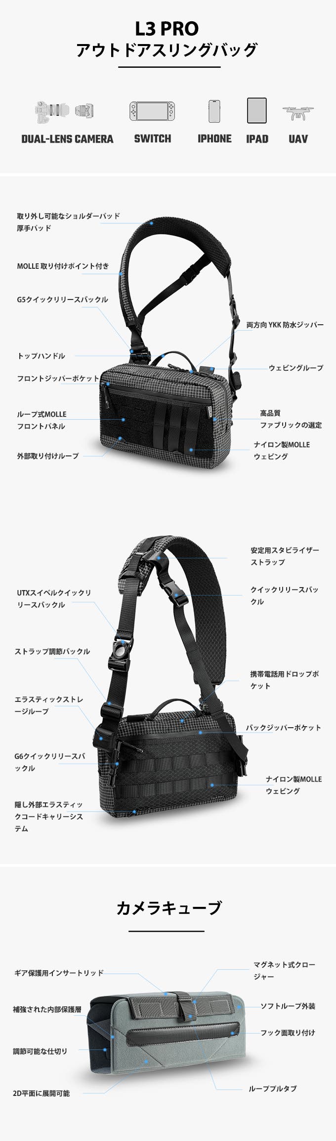 L3 PRO スリングバッグ(T60 ブラック×シルバー)は、都市でも自然でも使いやすい多機能バッグです。