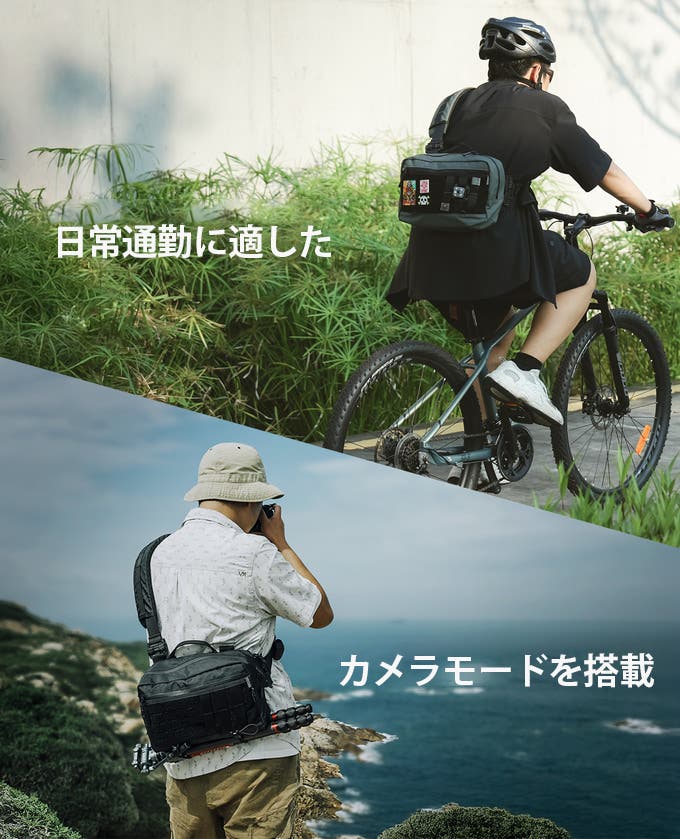 通勤、旅行、アウトドア、写真撮影など、様々なシーンで活躍する多用途バッグです。