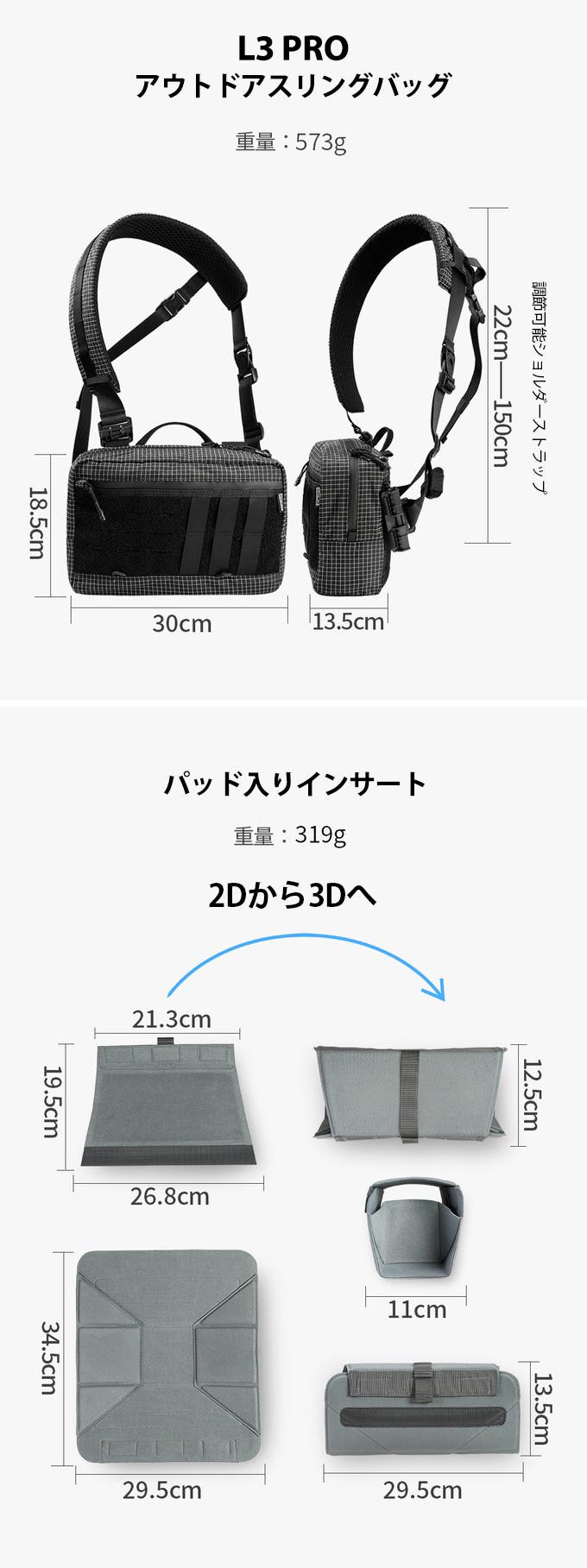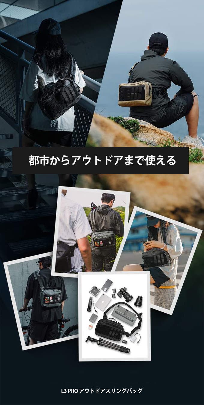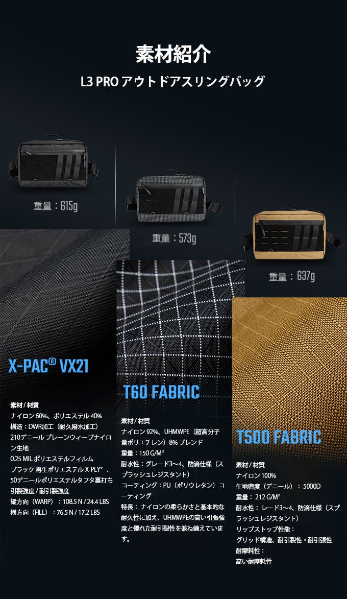 L3 PRO スリングバッグ(X-PAC)は、都市でも自然でも使いやすい多機能バッグです。
