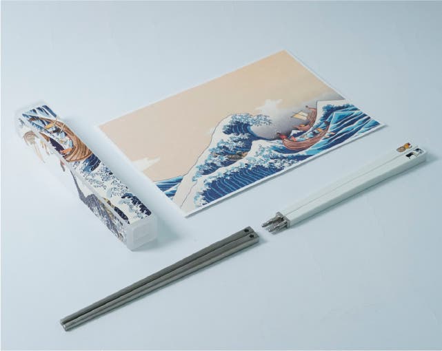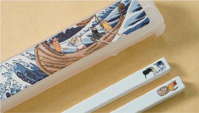 海外では「The Great Wave」と言われ、大人気な葛飾北斎の「神奈川沖浪裏」とかわいい猫がコラボした、特別なコラボ携帯箸もご用意しております。箸ケースと同デザインのポストカードも同梱されています。