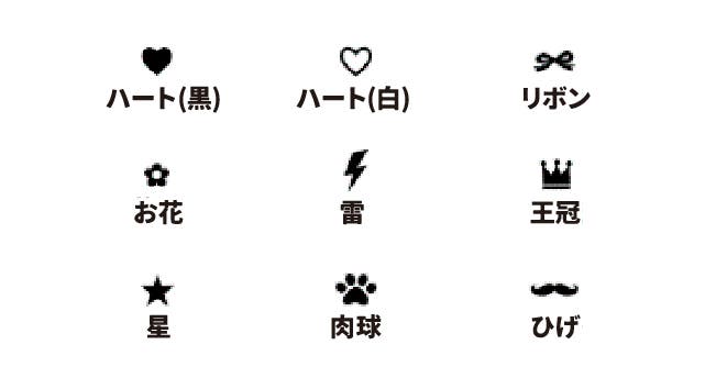 また、ハート(黒)、ハート(白)、リボン、お花、雷、王冠、星、肉球、ひげのアイコンを入れることもできます。