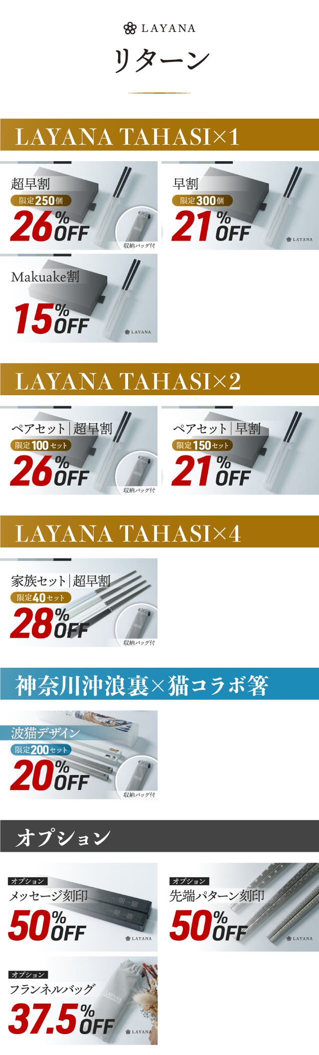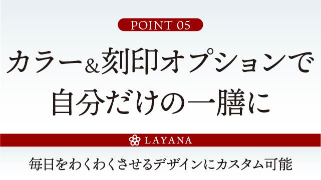 食事の時間をもっと自分らしい時間に。LAYANA TAHASIは4色展開に加え、2か所の刻印オプションでオリジナル仕様にすることができます。毎日の食卓を彩る、あなただけの一膳です。