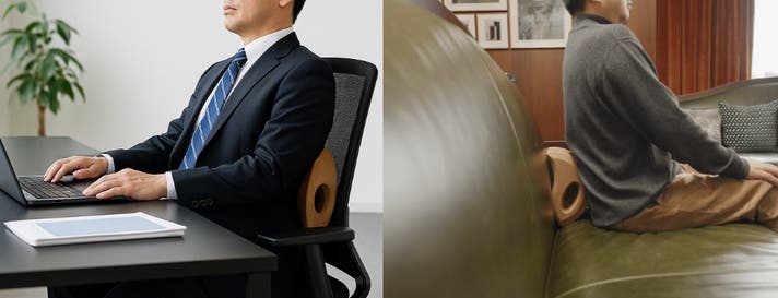 ソファや椅子に挟むだけで、骨盤から自然と背すじが伸びる。やわらかな曲線が背中に心地よく沿い、“ながら”で姿勢が整う実感を。