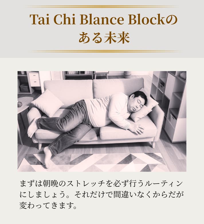 Tai Chi Blance Blockは、1台でストレッチ・トレーニング・セルフリハビリ、使わない時はインテリアとして使用できる現代の日本の家庭には理想のツールだと自負しております。