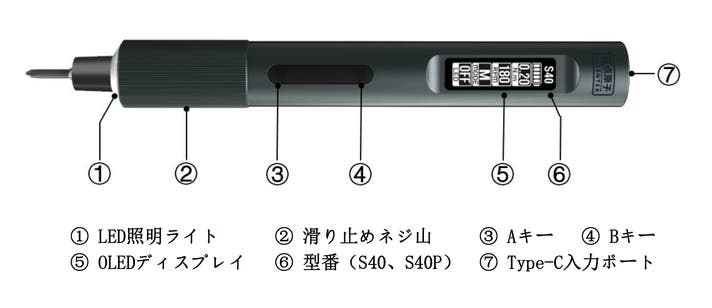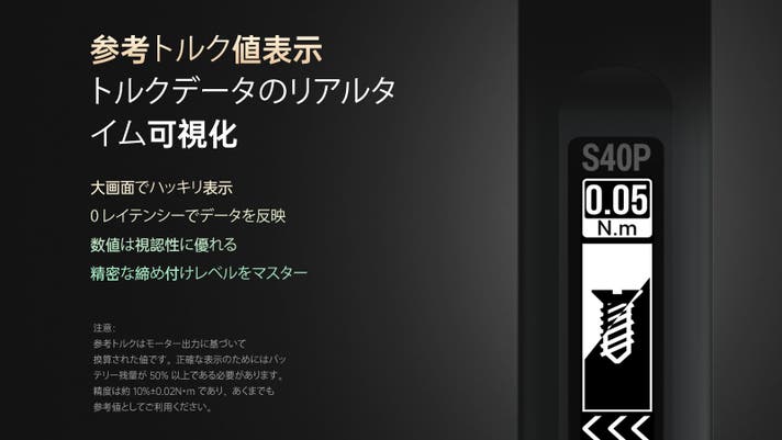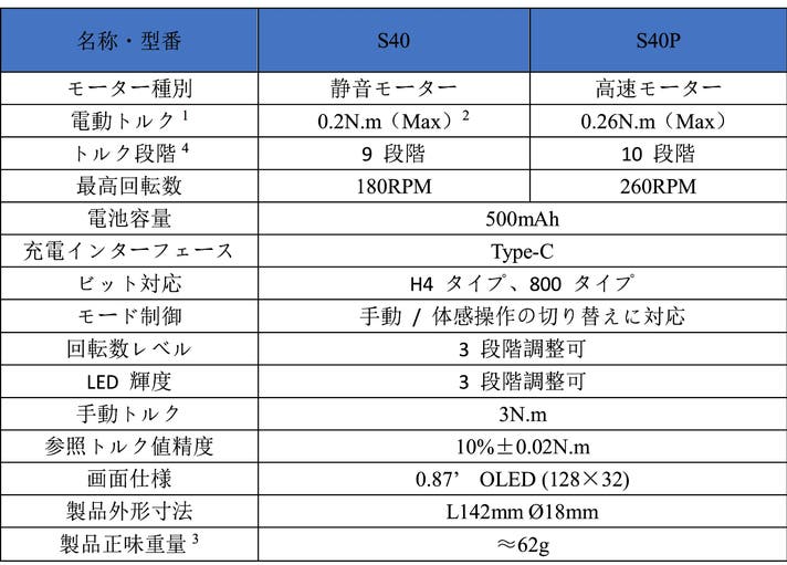 注 4:S40 モデルのトルクは 9 段階調整可能、S40P モデルのトルクは 10 段階調整可能で、いずれも M モード(カスタムトルク設定)を含みます。