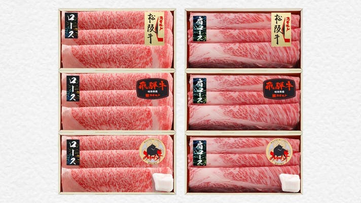実は、「松阪牛・飛騨牛・みかわ牛」の3銘柄を、「ロース(または肩ロース)」という高級部位だけに限定して一度に楽しめるセットは、市場においてほとんど流通していません。