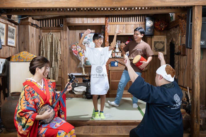 - 【タレント × 民謡 × 沖縄そば作り】の融合。ここでしか味わえない独自の演出