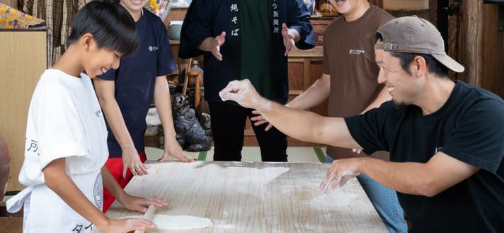 足でしっかり踏み、手で生地を伸ばし、好きな太さに切り、最後は自分で作ったそばを味わう——。