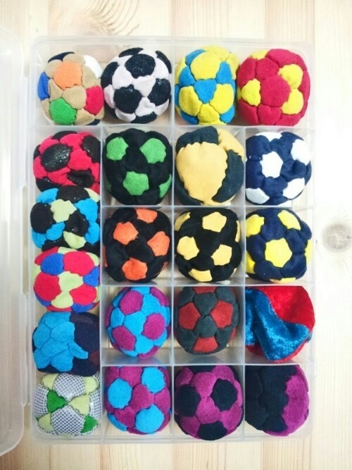私が一つ一つ丁寧に縫って制作したフットバッグです。長年の経験から培った知識を元に生地や中身を調整して初めから使いやすいフットバッグに仕上げています。