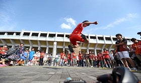 フリースタイルフットバッグは直径5cm程のお手玉のようなボールを主に足を使って様々な技を繰り出す芸術スポーツです。