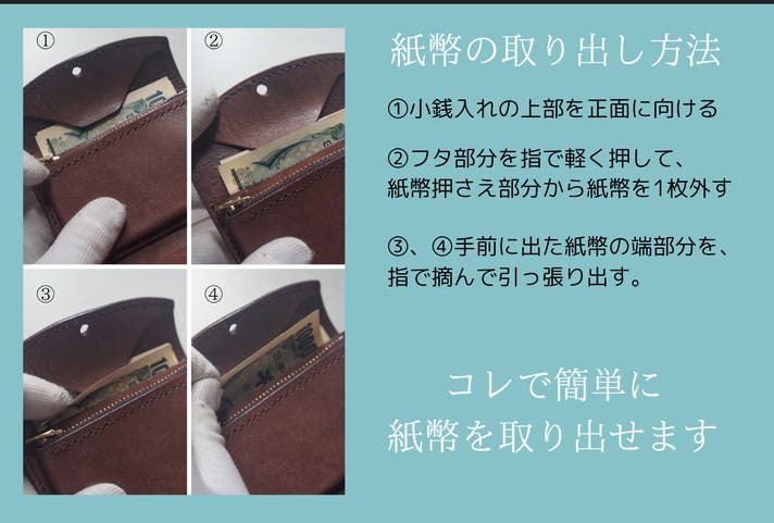 小銭入れ上部からの取り出しの際、フタ部分の紙幣押さえを利用することで、かんたんに1枚ずつ取り出せます。