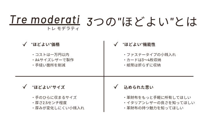 「Tre moderati」を製作した背景に、「革財布をもっと手軽に」、「イタリアンレザーの良さ」、「革財布の魅力」を多くの方に知ってほしいという思いがあります。