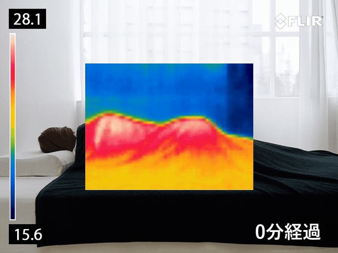 外気温16度前後の環境下で、本製品をかけた状態で表面の温度を5分おきに30分間測定。0秒の時点と30分後の被験者の表面温度が著しく変化していないことを確認。