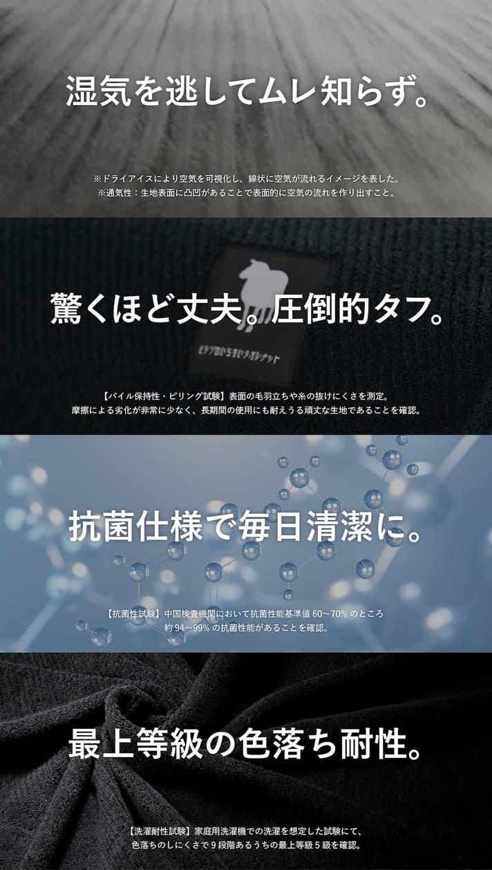 ※通気性:生地表面に凹凸があることで表面的に空気の通り道を作り出すこと。