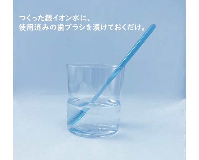 - できあがった銀イオン水は家中の除菌や抗菌に。 歯ブラシの除菌には超おすすめ。