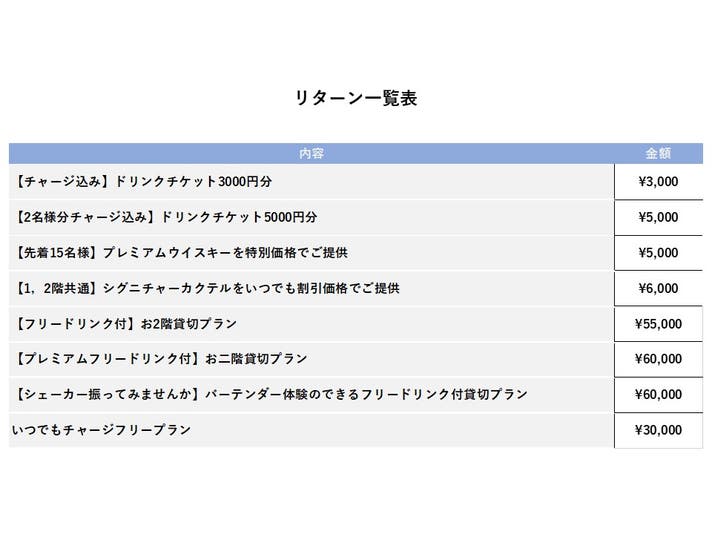 サポーター限定の特別プランです。ご予約前に2時間ほどバーツールの使い方等をバーテンダーがレクチャーし、体験していただきます。練習の成果のお披露目の場としてご予約のお客様の前でお好きなカクテルを1杯お作り下さい。バーテンダー体験が出来る貴重なプランをこの機会に是非お試しください。