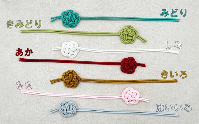 みどり・きみどり・しろ・あか・きいろ・もも・はいいろ の中からお好きな紐をお2つお選びください。