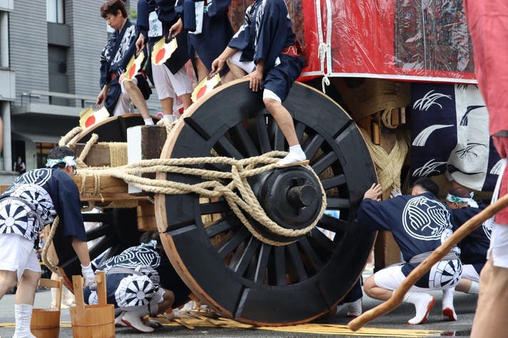 山鉾の車輪は、単に前進するだけではありません。巨大な車体を90度方向転換させる「辻回し」を行います。総重量10トンを超える鷹山を、路面に敷いた竹の上で滑らせて強引に回転させるこの作業は、車輪に凄まじい負荷をかけます。