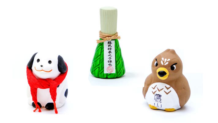 【おみくじ】鷹山の御神体である「鷹匠(たかじょう)」「犬飼(いぬかい)」「樽負(たるおい)」にちなんでおります。可愛らしい置物の中に、おみくじを納めた人気のシリーズです。