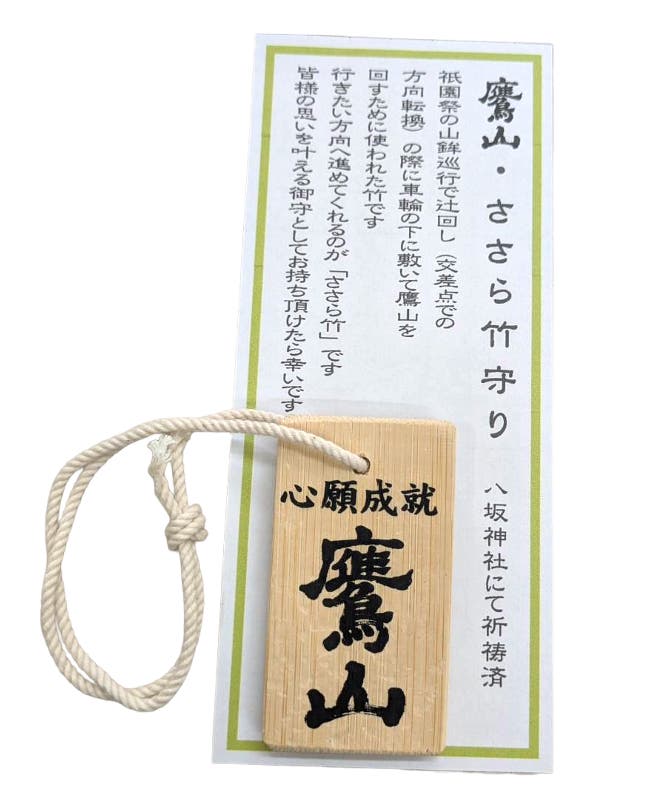 辻回しの際に車輪の下に敷いて鷹山を回すために使われた竹です。行きたい方向へ進めてくれるのが「ささら竹」です。皆様の思いを叶える御守りとしてお持ち頂けたら幸いです。