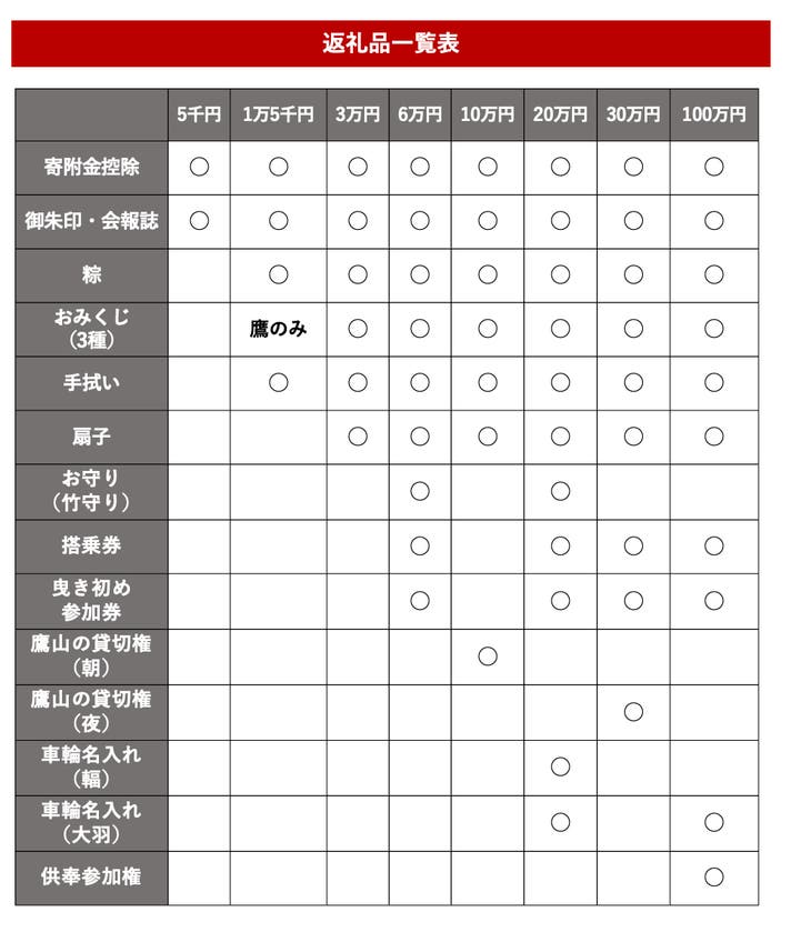 ■100,000円:鷹山の貸切権(朝)、粽、御朱印、手拭い、扇子、おみくじ3種(鷹・犬・粽)、会報誌