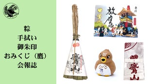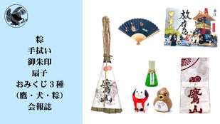 粽、手拭い、御朱印、扇子、おみくじ3種(鷹・犬・粽)、会報誌
