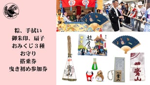 供奉参加権、車輪名入れ(大羽)、粽、御朱印、おみくじ3種、搭乗券、曳き初め参加券