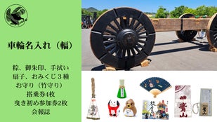 ■200,000円:車輪名入れ(輻)、粽、御朱印、手拭い、扇子、おみくじ3種(鷹・犬・粽)、お守り(竹守り)、会報誌、搭乗券4枚、曳き初め参加券4枚