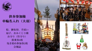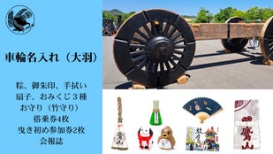 ■200,000円:車輪名入れ(大羽)、粽、御朱印、手拭い、扇子、おみくじ3種(鷹・犬・粽)、お守り(竹守り)、会報誌、搭乗券4枚、曳き初め参加券2枚