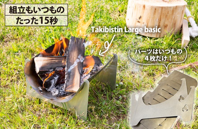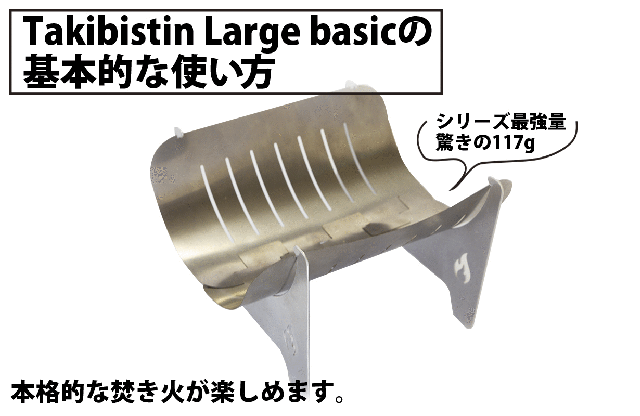 シリーズ最軽量の117gのTakibistin Large basicの部品はたった4枚ですが、本格的な焚き火が楽しめ、何よりも軽量コンパクトを求める方にオススメです!