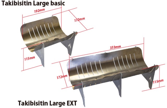 Takibistin Large EXTはTakibistin Large basicを連結したモノで、横幅は約2倍!30センチ程度の薪も使用できる本格的な焚火台にトランスフォームします。オプションのgotock(ラージ専用ゴトク)をセットすると調理の幅も広がります。