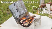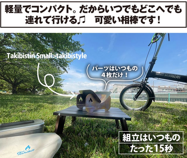 [takibistyleタキビスタイル]は、小さいながらも本格的な焚き火が楽しめる形態です。自転車キャンパーやリバーツーリングなどを楽しむカヌーイストにもピッタリ。