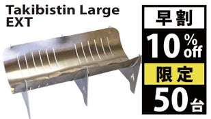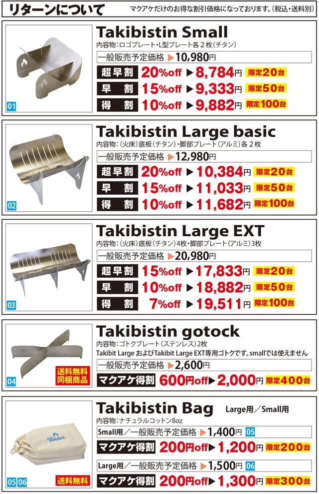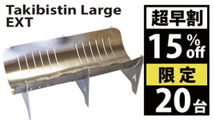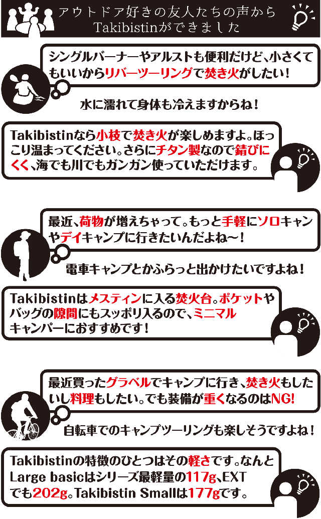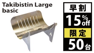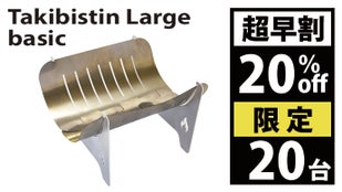 ・掲載されている商品は開発中のものもあります。デザインや仕様は、変更される場合がございます。 ・応募状況を確認しながら、常にストックを用意する予定ではありますが、 ご注文状況や使用部材の供給状況、製造工程の都合等により、出荷時期が遅れる場合があります。 ・皆様の応援購入により、量産効率が向上した場合、正規価格が販売予定価格より下がる可能性があります。・使用部材は国産のチタン、ステンレス、アルミです。価格変動と為替相場の影響を大きく受ける製品であることをご了承ください。・Takibistin Largeの底板は0.3ミリのチタンです。構造上鋭利になっている部分もございます。組立や分解の際には、手袋などを着用して怪我には十分お気をつけてください。・焚き火などで付いたススは、重曹などで取り除くことができますが、チタン特有の燃焼による酸化皮膜も取れる場合がございます。また繊細な加工を行っている箇所がございます。スポンジなどで磨いた時に力を入れすぎると変形したり怪我をするような場合がございます。十分にご注意ください。 ・Takibistinを安全に楽しむには下記の内容に十分注意してください。 焚き火が禁止されているところでは行わない。 強風下では行わない。 延焼のおそれがあるところでは行わない。 焚き火の最中は火元から離れない。 焚き火の最中にTakibistinを動かさない。 芝へのダメージを少なくするためにスパッタシートやミニテーブルの上で行う。 その他、周りに迷惑をかけないようにご注意ください。 灰や燃え残りをそのまま放置しないでください。 ルールを守って安全対策を怠らず、楽しい焚き火をお楽しみください。