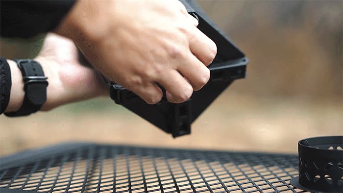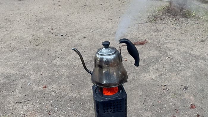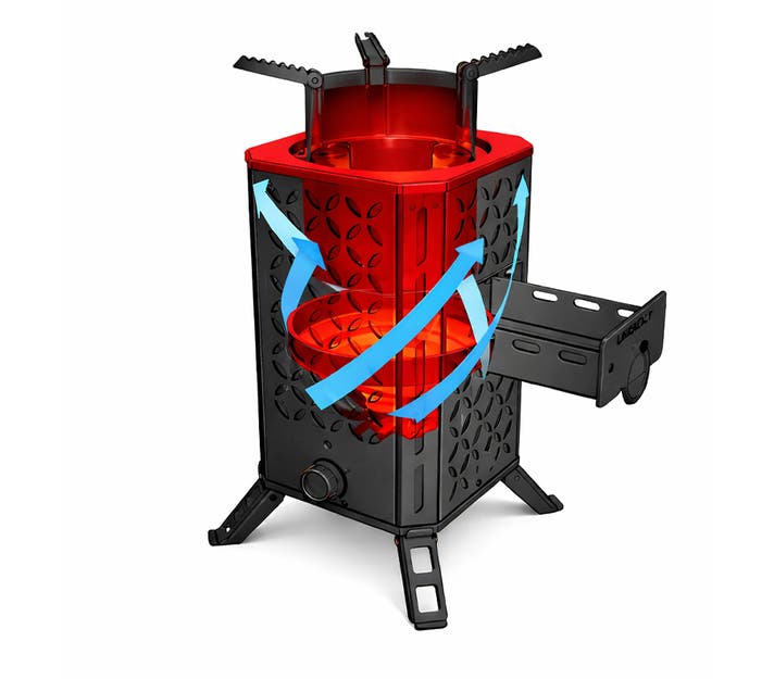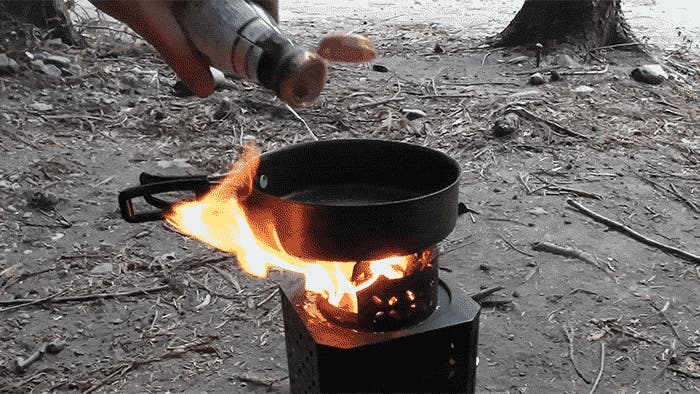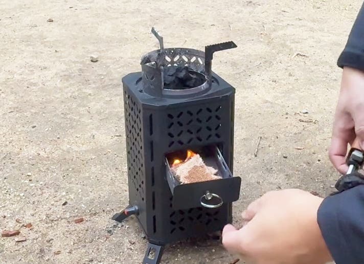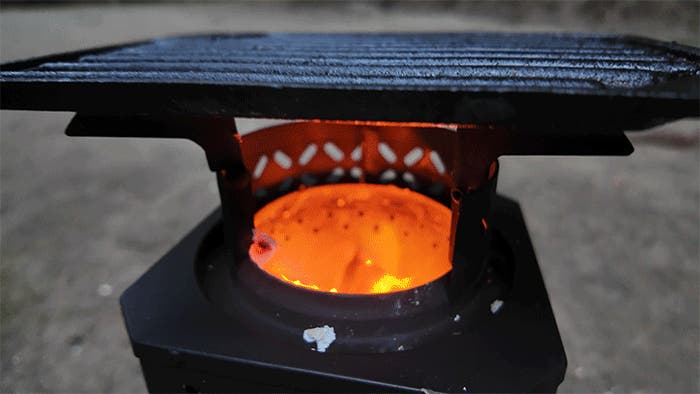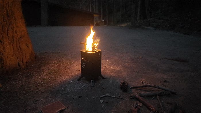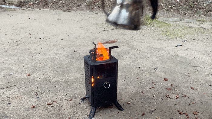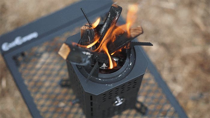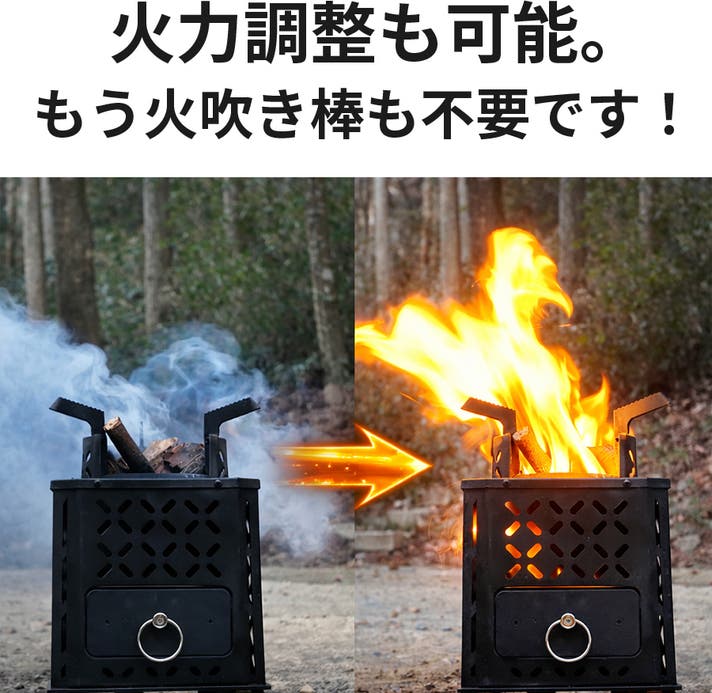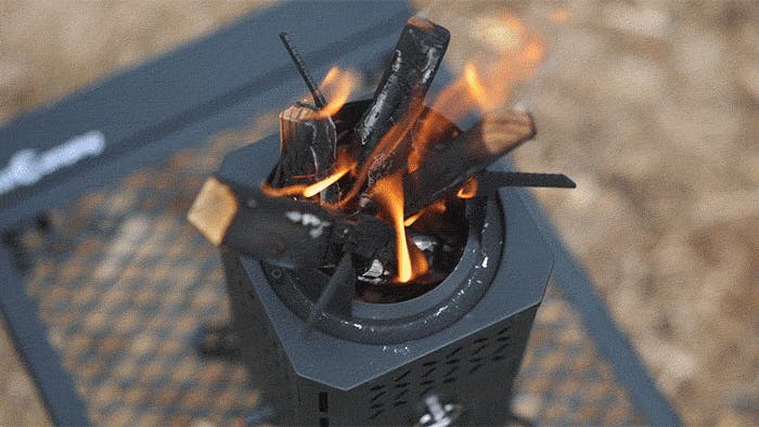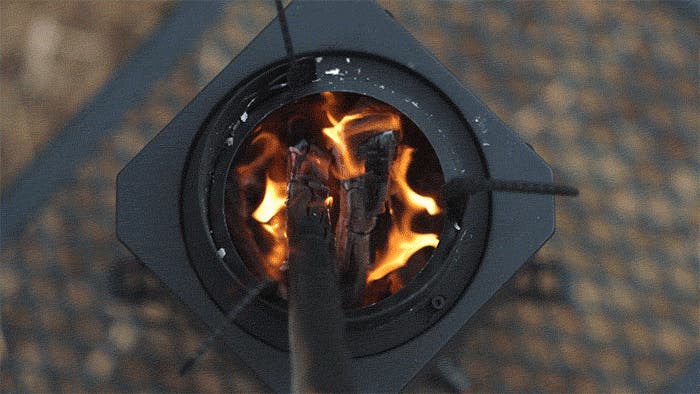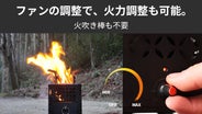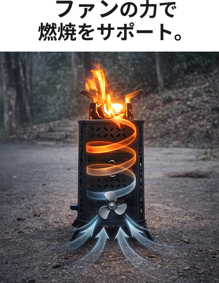 底部のファンが空気を送り込み、燃焼をさらに加速。小枝や落ち葉といった自然の燃料でも、しっかり火力が出ます。