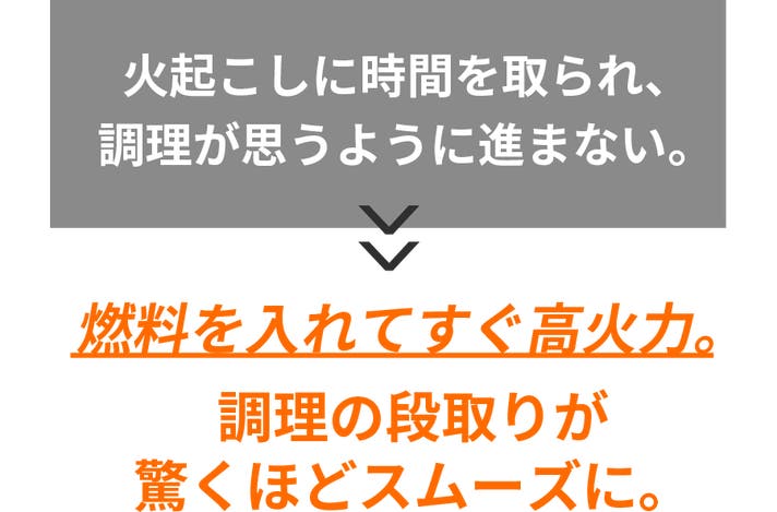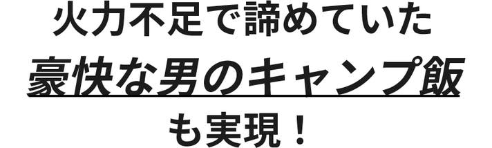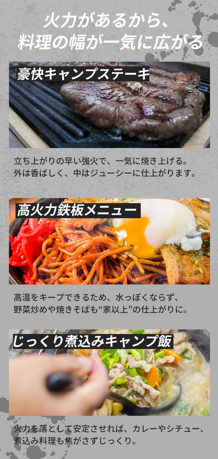 効率的な燃焼構造とファン送風により、短時間で強い火力を実現。これまで難しかった火加減も調整でき、焼き料理から鍋料理までキャンプ料理の幅が広がります。