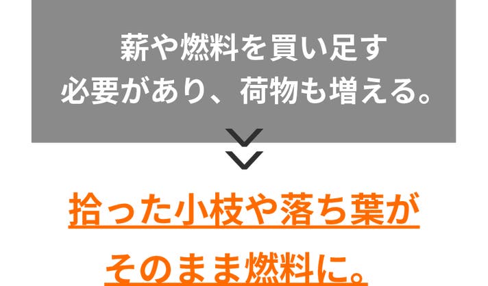拾った小枝や落ち葉など、少量の燃料でもしっかり燃焼!