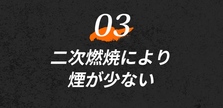 - 送風ファンが燃焼をサポート。独自のVortex(渦)炎技術で2次燃焼を促進し煙を大幅カット