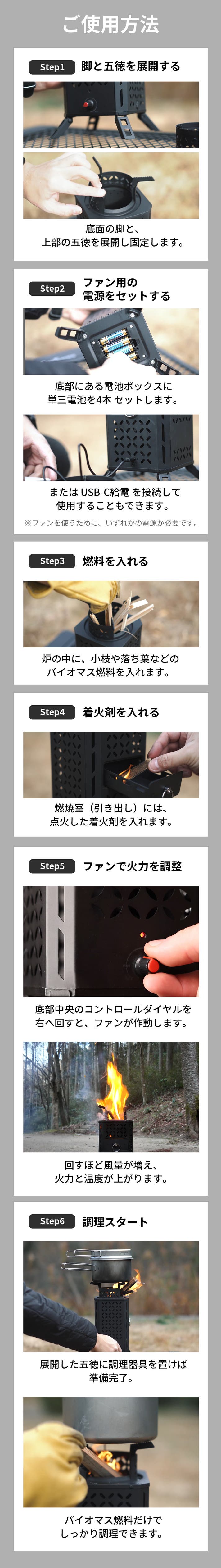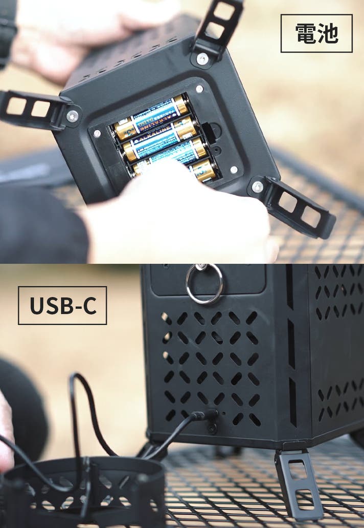 A. バイオマス燃料で使用できますが、ファンを使用する電力として、単三電池4本またはUSB-C給電が必要です。