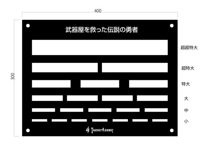 今回応援購入していただいた方には、素敵なリターン品をご用意しています。武器屋を救った伝説の勇者たちとして匠工芸特製のアクリル銘板W400×H300にご署名を印刷し、今後全国で展開するPOPUPストアのカウンター前に展示させていただきます。応援購入の額に応じた文字の大きさでの掲載となります。